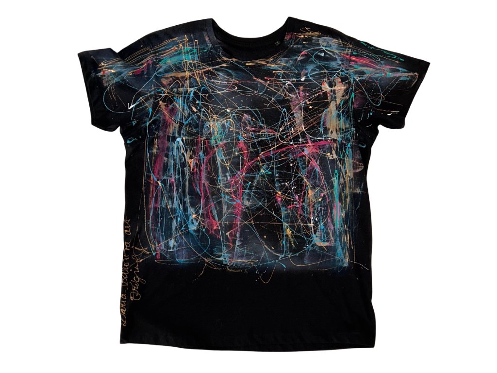 Super příjemné černé organické tričko s ruční malbou na téma brouzdání v mysli