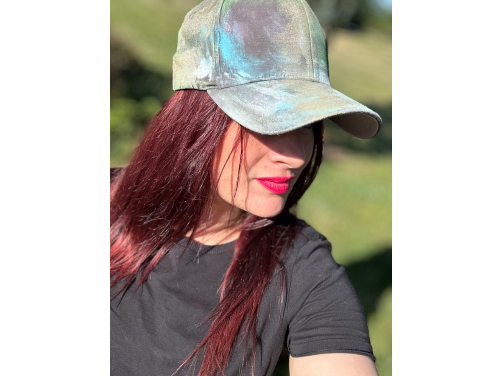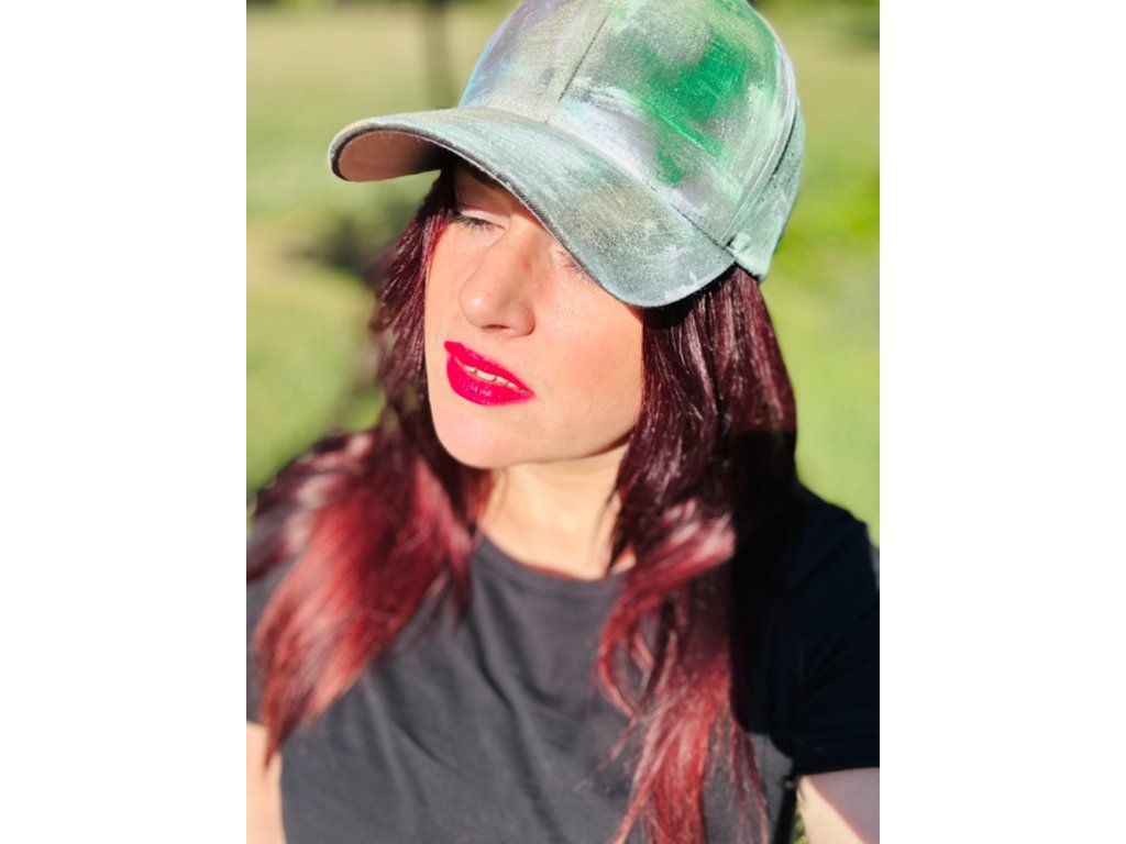 Jako kontrastní doplněk, který vám dotvoří outfit. Celý v černém a jako akcent kšiltRučně malovaný s metalickými a efektovými barvami ozdobený