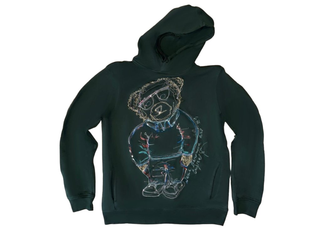 Úžasná měkkoučká láhvově zelená organická mikina s kapucou a kapsami. Ruční malba a modelem mi byl můj plyšový medvídek z dětství. Tak trochu raubíř, tak trochu lump v ryflíčkách. Obrázek je decentní, vyniká na světle
