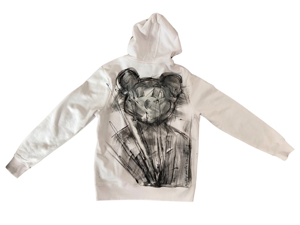 Malba na zádech, kde je vyobrazen Mickey mouse a na přední straně doplněna malbou a textem